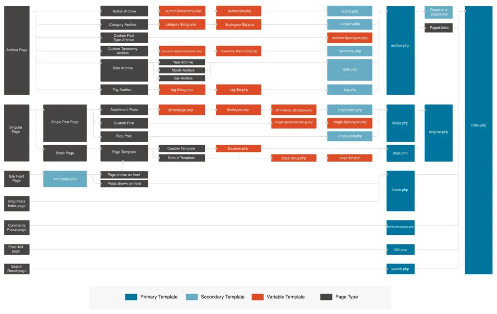 El siguiente gráfico ha sido sacado de wphierarchy.com, y como verás muestra todas los nombres de archivos que pueden intervenir en la jerarquía de un tema de WordPress.