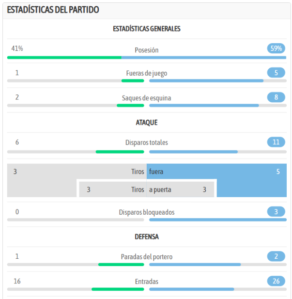 | Goles | 1 – 1 6′ Aldo One 0 – 1 3′ (p.)Kike García 1 – 2 46′ Kike García |